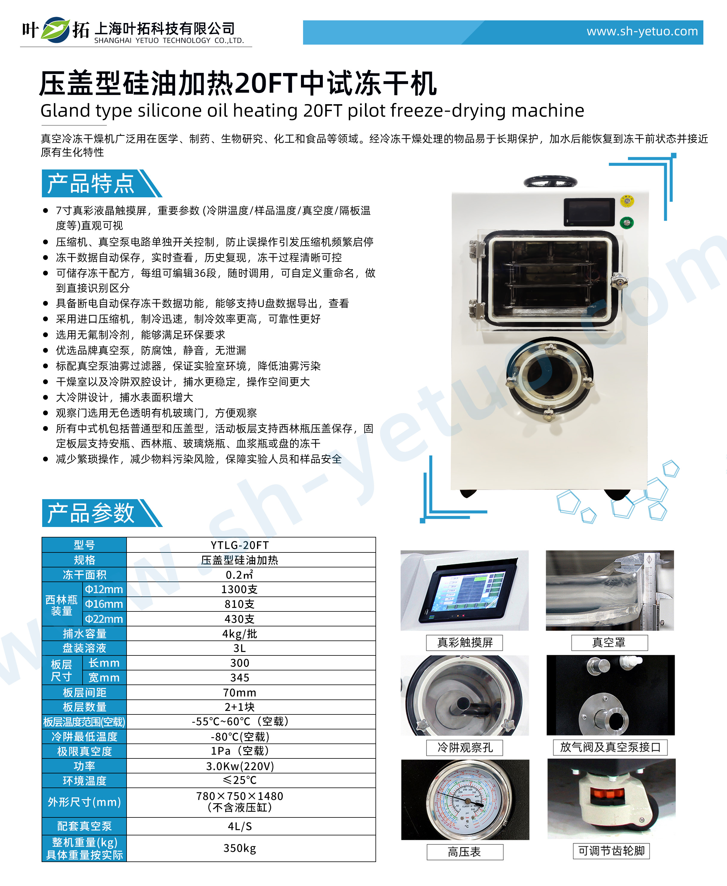 Product features of Ye Tuo YTLG-20FT pressure cap 0.2 square silicone oil heating freeze-drying machine: