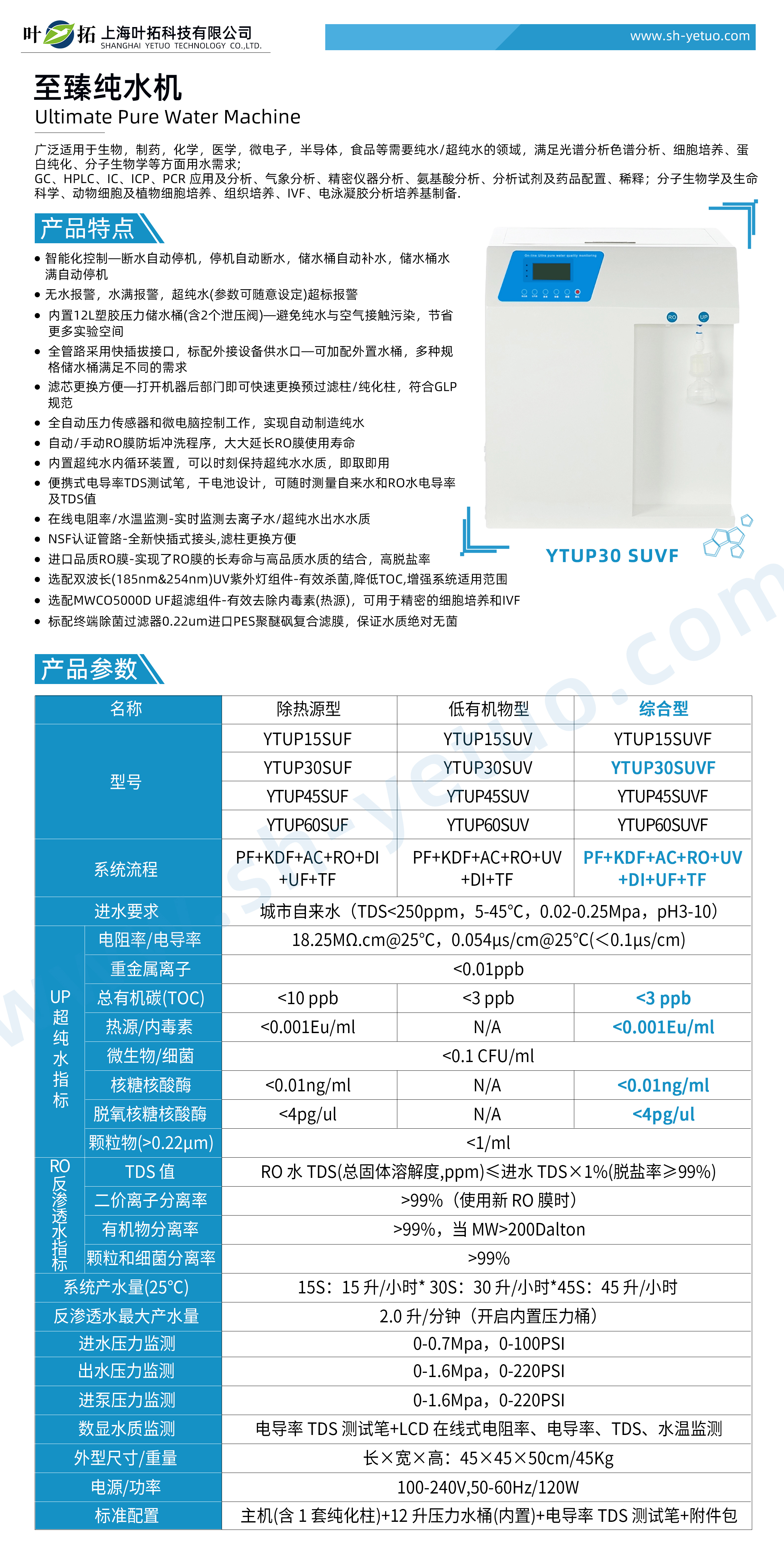 葉拓 YTUP30SUVF 超純水機(jī)(綜合型)詳細(xì)參數(shù)