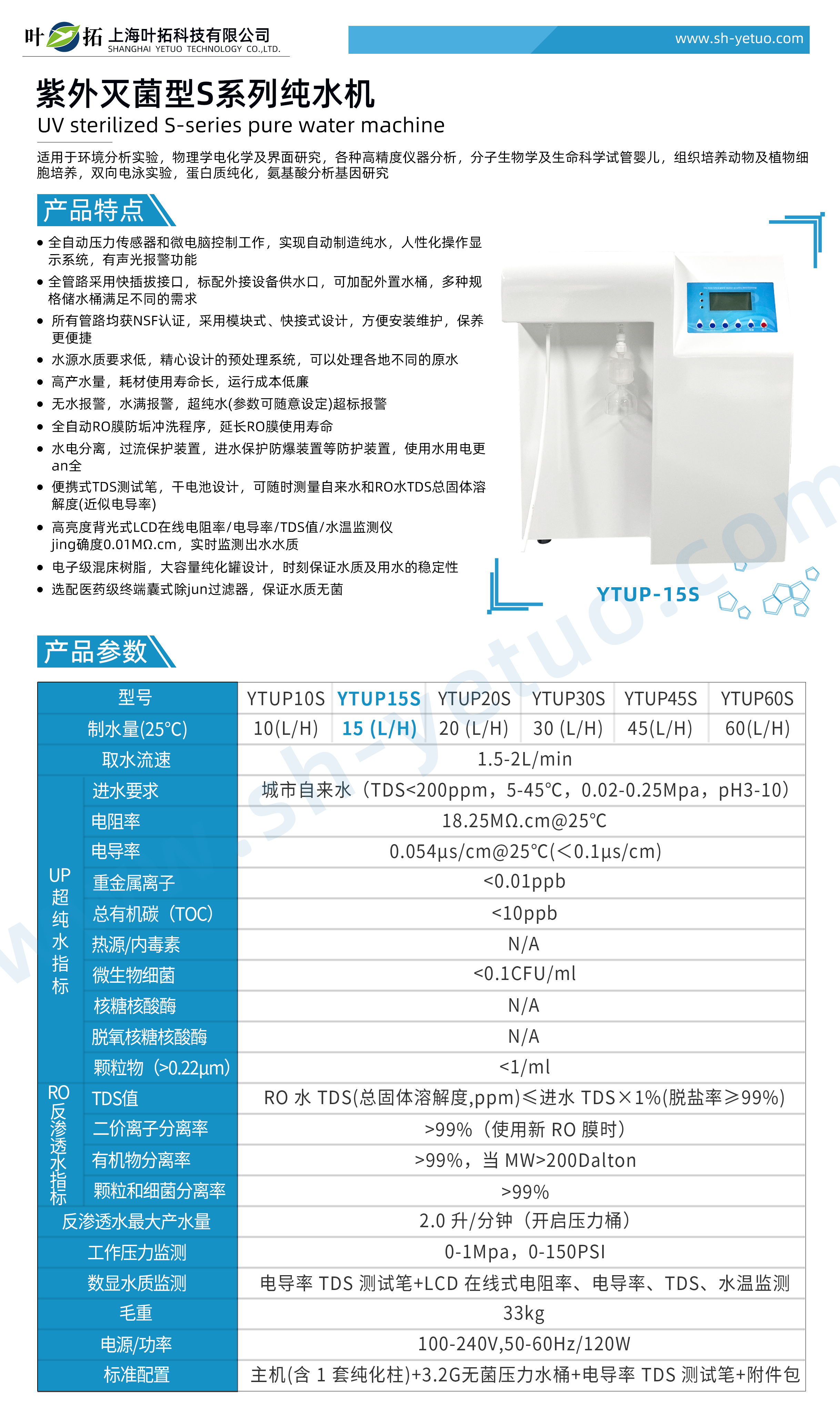 葉拓 YTUP15S 標準型超純水機詳細參數(shù)