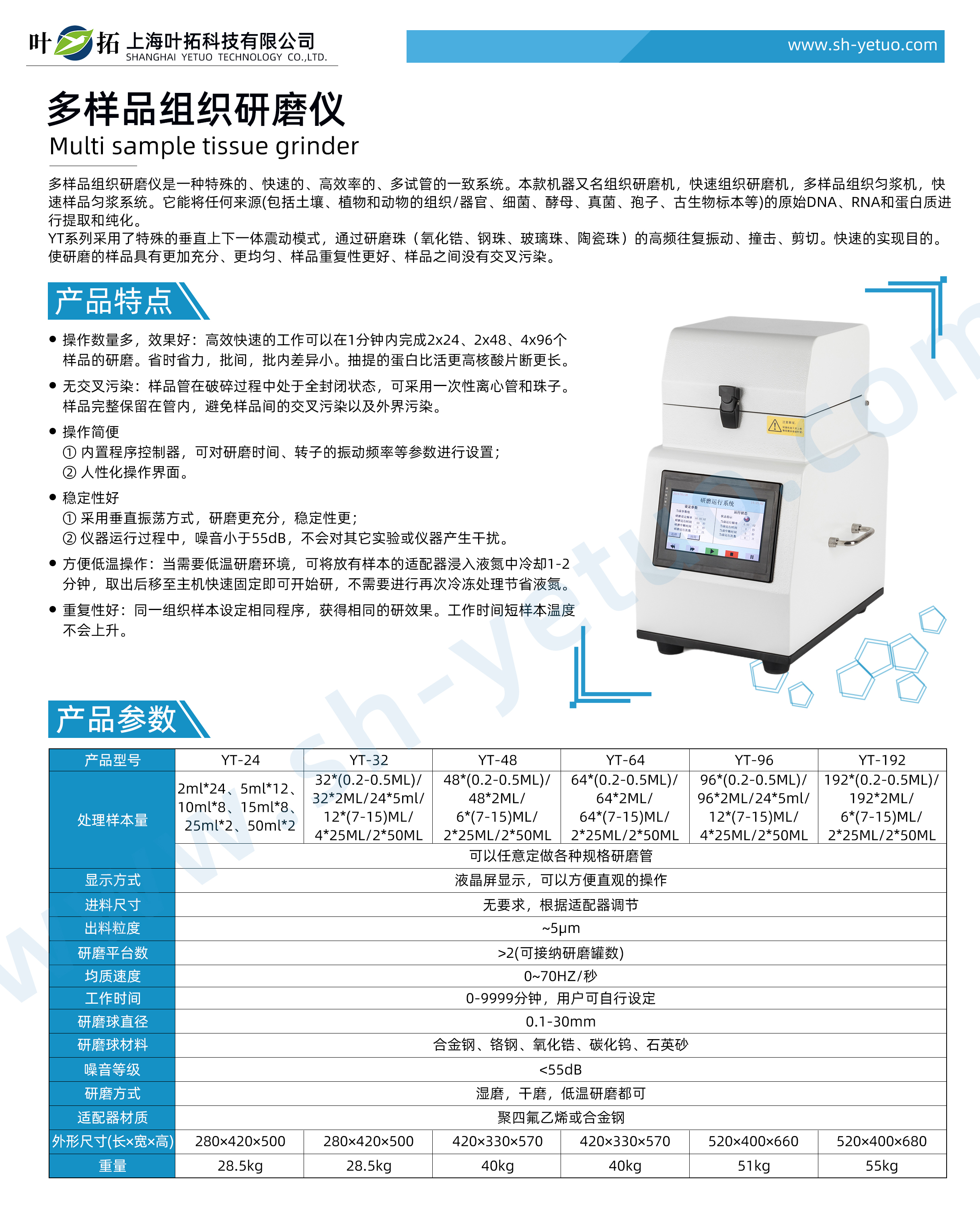 YT系列采用了特殊的垂直上下一體震動模式,通過研磨珠(氧化鋯、鋼珠、玻璃珠、陶瓷珠)的高頻往復振動、撞擊、剪切。快速的實現目的。使研磨的樣品具有更加充分、更均勻、樣品重復性更好、樣品之間沒有交叉污染。